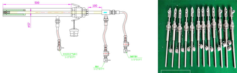 噴嘴為310S不銹鋼、槍桿310S不銹鋼、安裝套管為316L、可加耐磨套管(碳化硅套管)